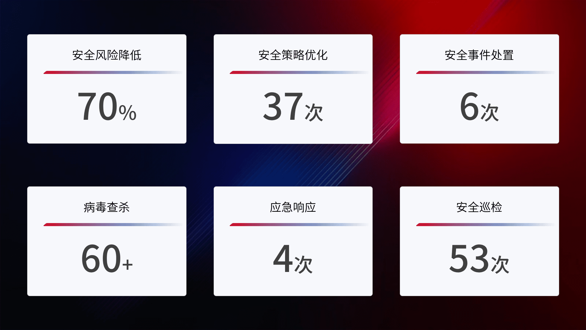 提供全面的安全事件报告体系,,包括处置报告、、、周报、、、季度和年度总结,,结合持续监控,,帮助客户深入了解网络安全状况。。