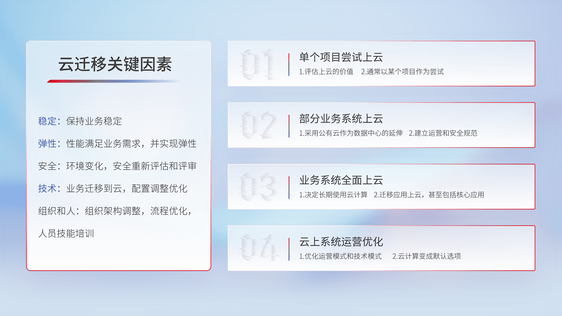 结合实际业务,,从规划设计、、、云平台选型、、、云原生改造、、、、数据迁移、、、、集成交付,,迁移全过程为客户识别最佳上云路径,,,,做好风险识别管理,,,设计网络架构、、、、身份权限、、、、安全审计合规、、、操作审计、、、日志审计、、、、监控告警策略、、、多站点容灾设计等,,,对云上基础设施进行整体规划,,提升IT治理水平,,,,以满足弹性、、、、高可用、、、高性能的需求。。