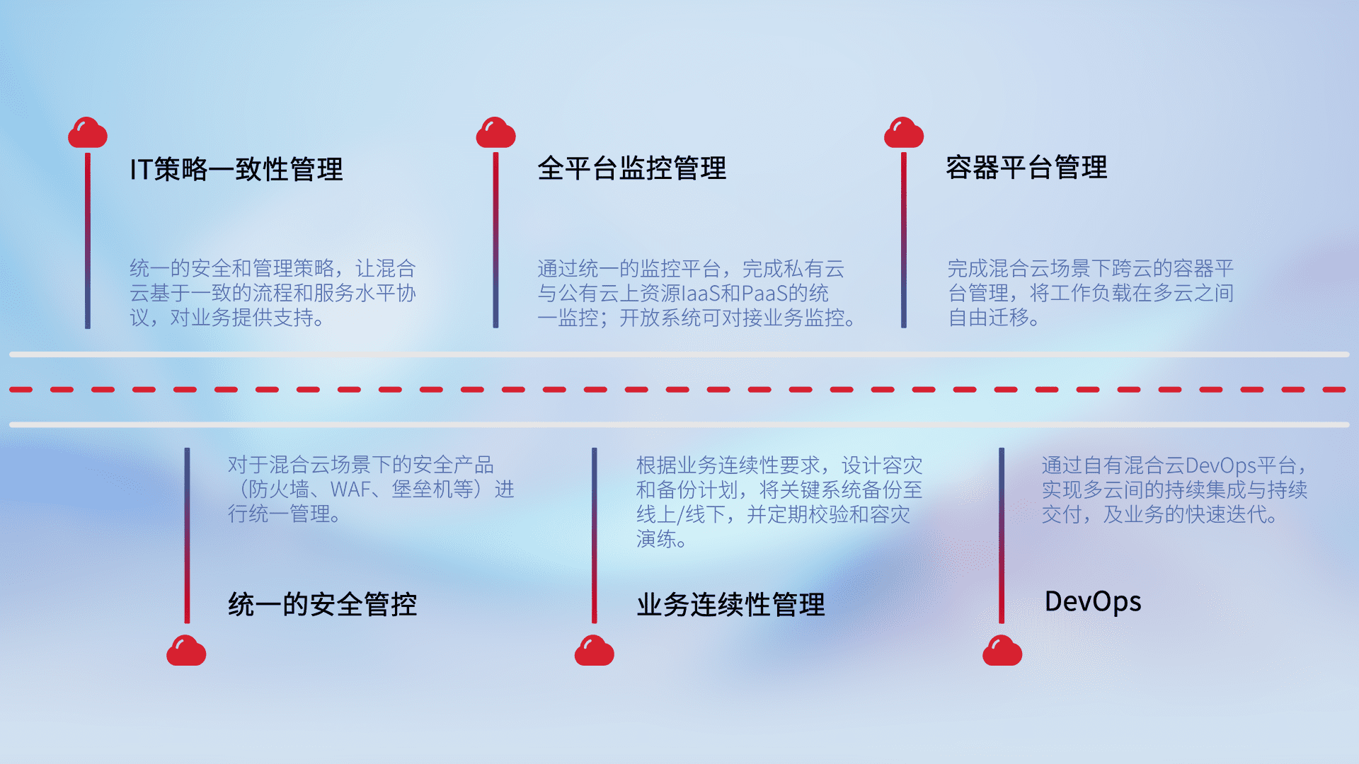 通过多云纳管,,,以统一的资源数据模型把客户的云资源进行抽象和封装,,进而实现对多云资源的统一操作,,,,保障云资源管理的可靠性、、、稳定性与可用性。。。量身定制化运维内容,,配置、、、、开发运维、、、、补丁管理、、备份、、监控、、、认证和访问管理、、、审计和日常巡检等,,,,保障在用云过程中的可靠度,,,稳定度以及高可用率。。。